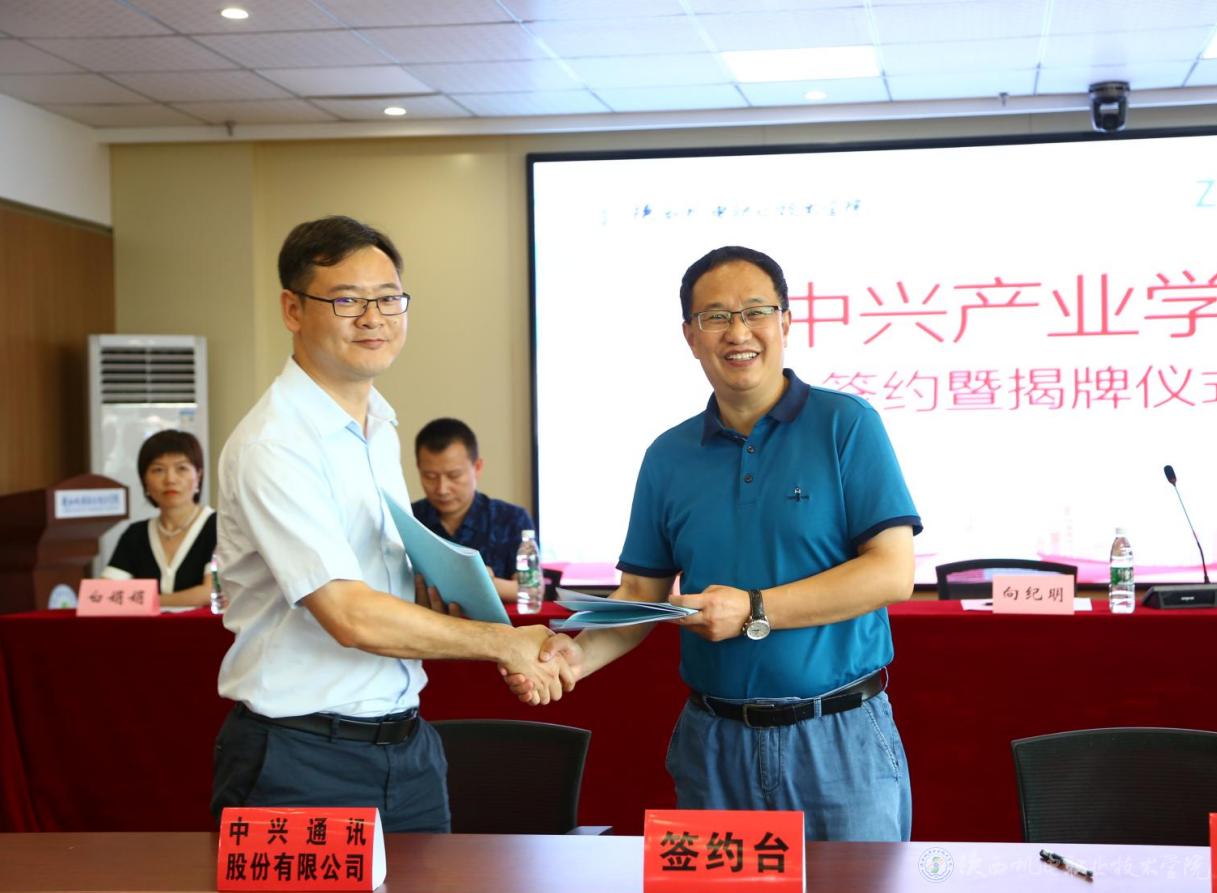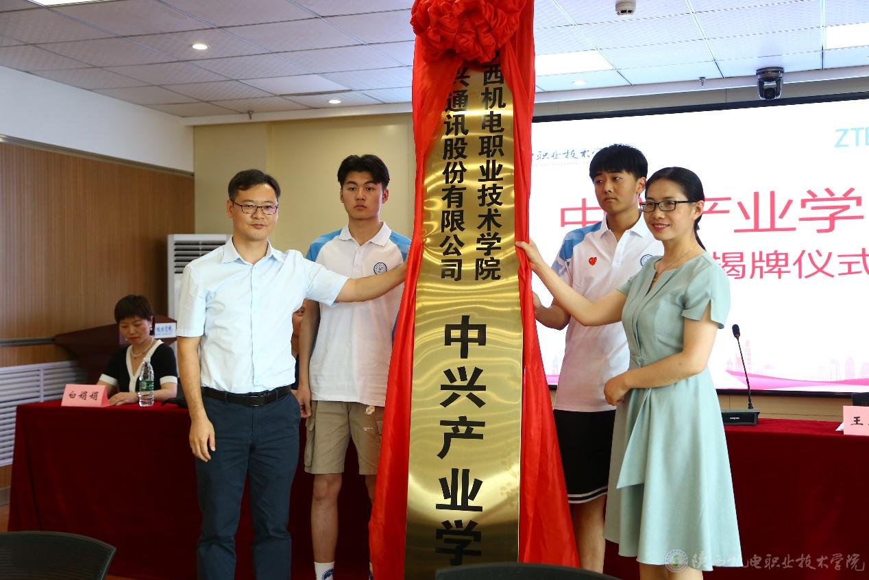 2021年7月6日,中兴产业学院签约暨揭牌仪式在宝福路校区汽车机电大楼举行,参加仪式的嘉宾有:中兴通讯西安生产部部长王小林、终端配送部部长李席、生产部技术科科长刘建涛,陕西机电职业技术学院党委副书记、校长向纪明,党委委员、副校长张琴,招生就业处、校企合作处处长,教务处处长,电子与信息学院党政负责人。本次签约暨揭牌仪式由副校长张琴主持。