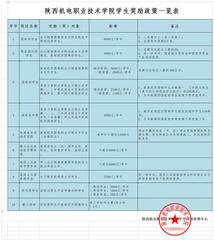 陕西机电职业技术学院学生奖助政策一览表(2023年)