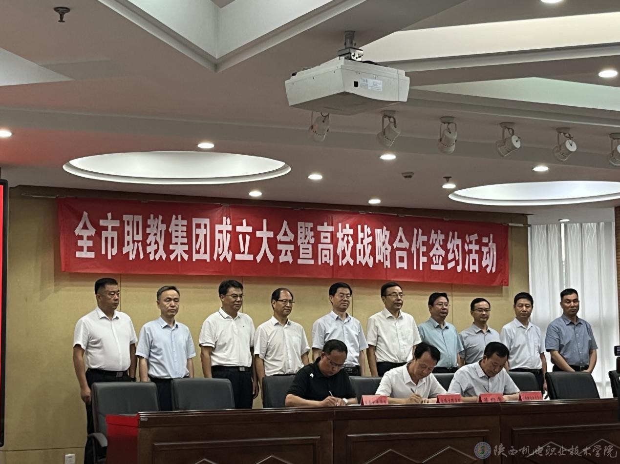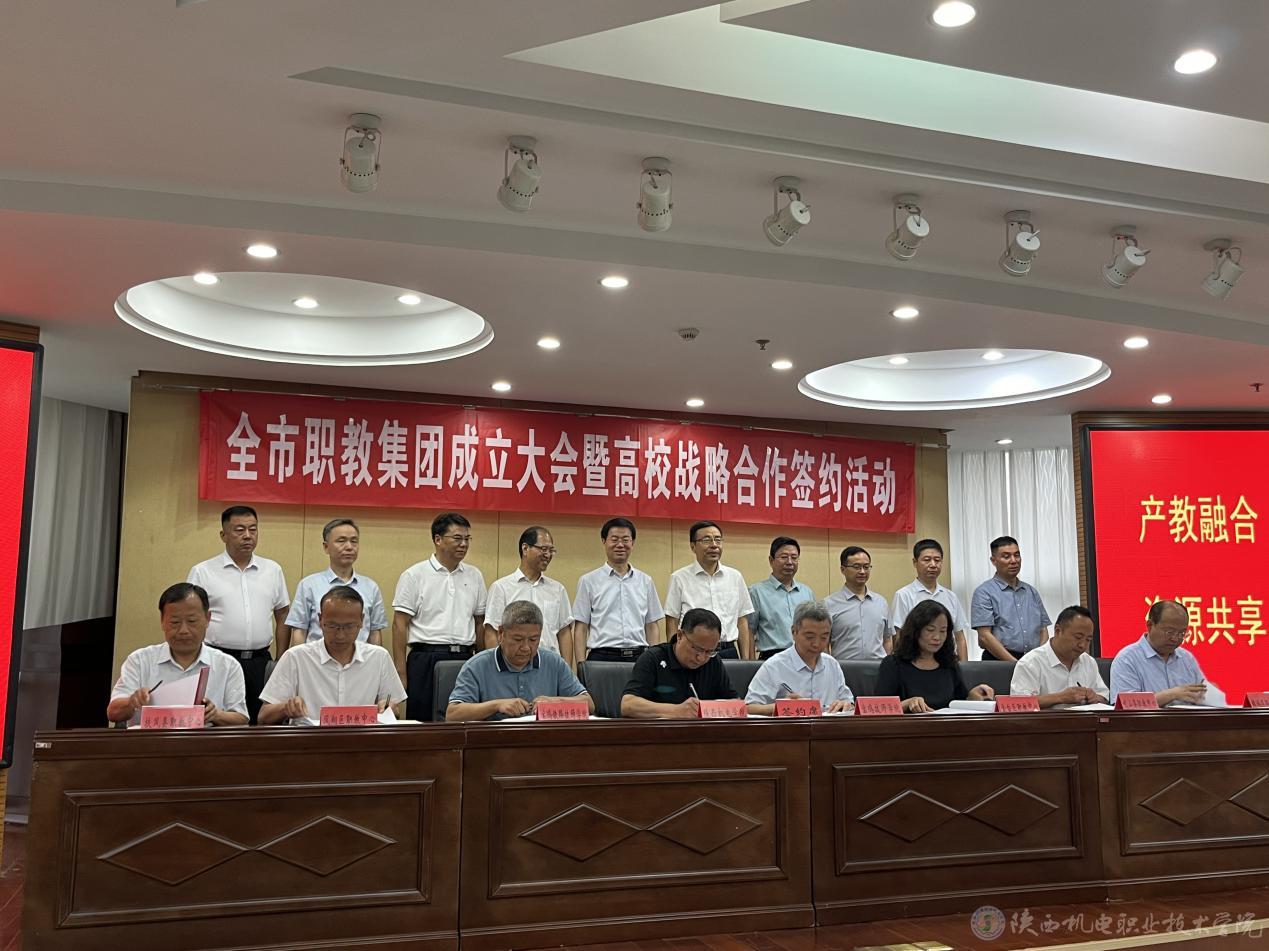 向纪明与金台区职业教育中心、凤翔区职业教育中心、岐山县职业技术教育中心、扶风县职业教育中心、麟游县职业教育中心、宝鸡技师学院、宝鸡铁路技师学院7所院校负责人共同签订陕西机电职业技术学院教育集团战略合作协议。