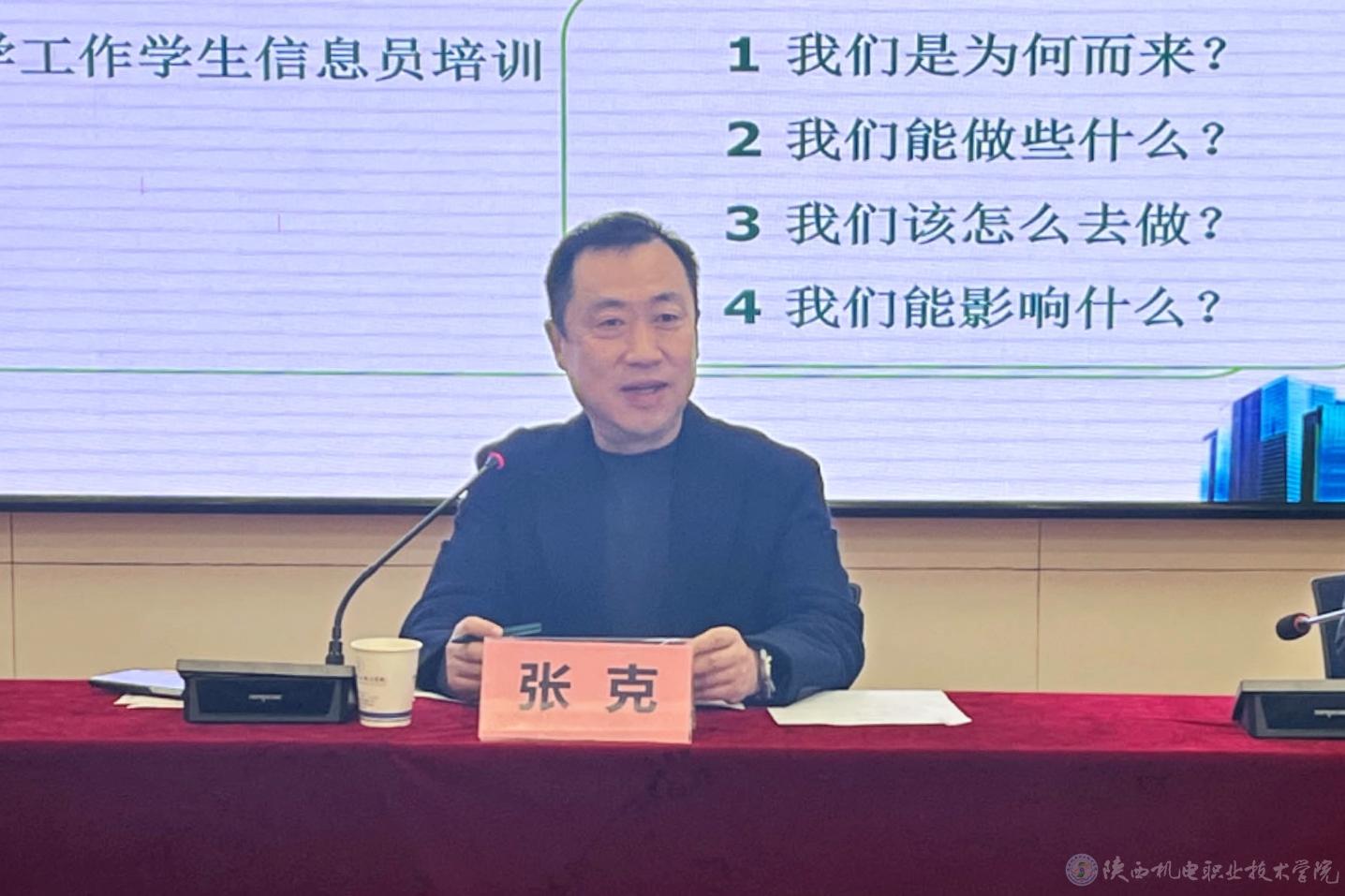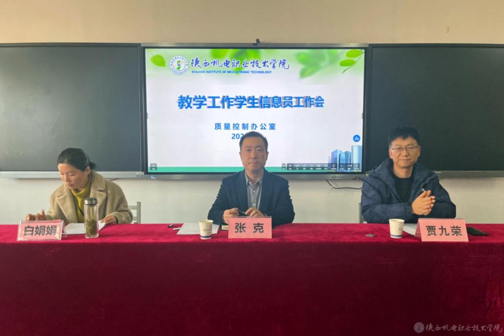 为进一步提升学校教育教学质量,加强内部质量保证体系建设,引导和培养学生信息员的工作能力和工作水平。陕西机电职业技术学院于11月19日和20日下午分别在宝福路校区和蟠龙校区召开了2024年度教学工作信息员会议。学校党委委员、副院长张克,教务处处长白娟娟,校团委书记、学生处副处长王枢,质量控制办公室主任贾九荣,以及200多名信息员参加了会议。会议由质量控制办公室教师宁静主持。